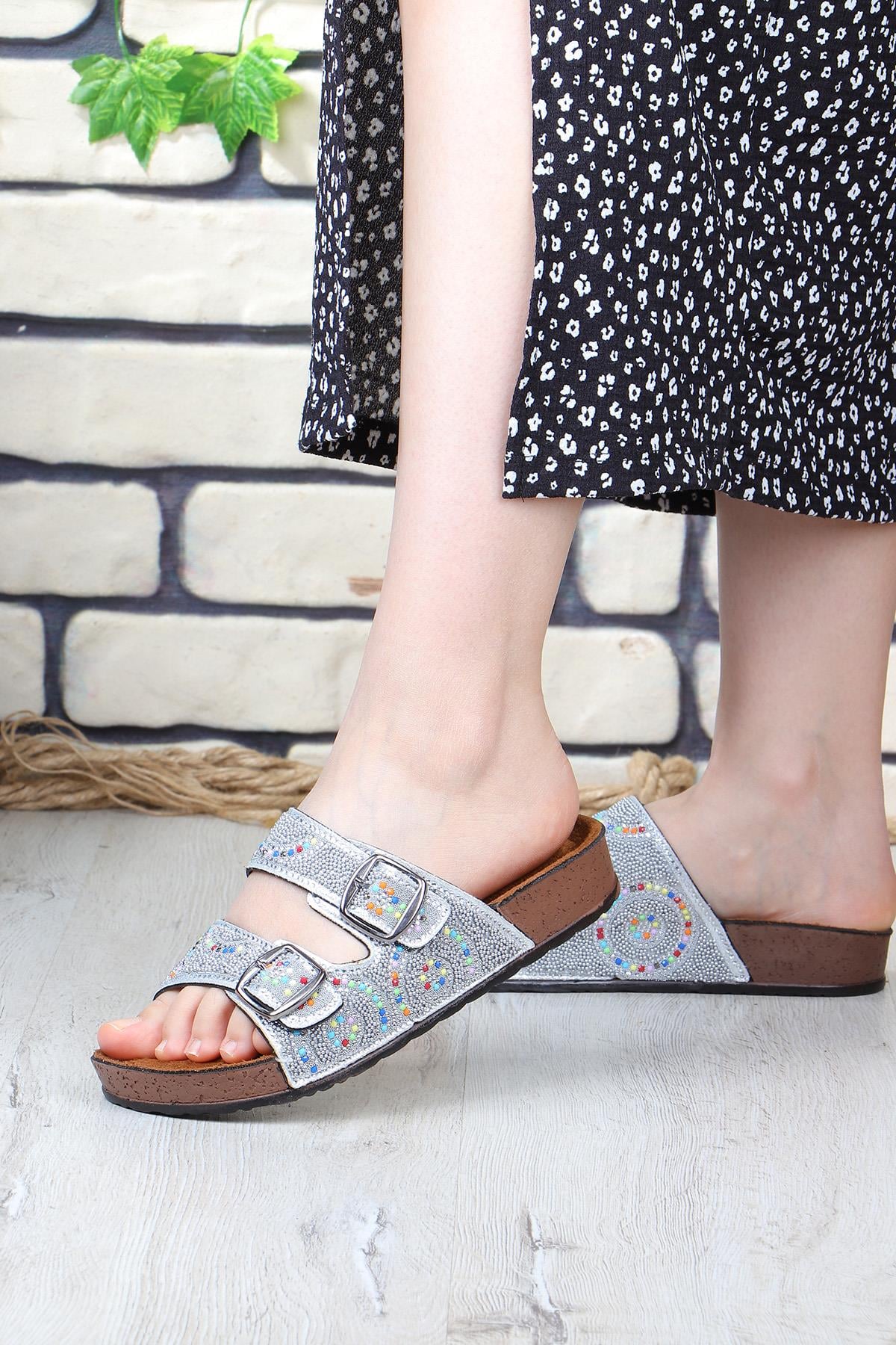 Vojo Circle Ortopedik Taşlı Çift Tokalı Plaj Kadın Terlik